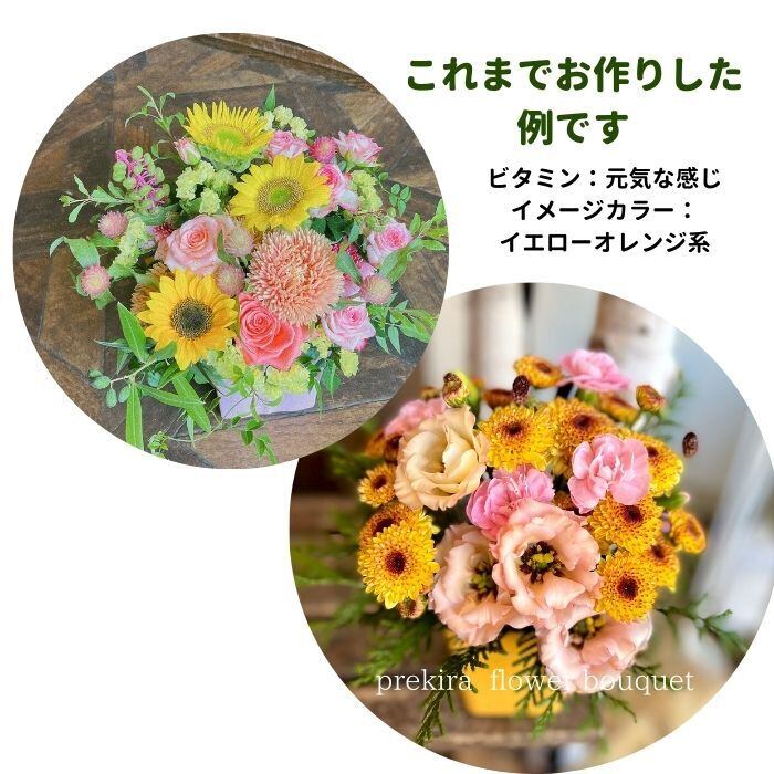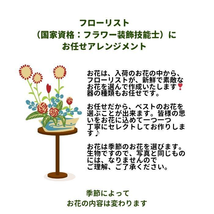 この商品は、お届け先のご希望に応じて、心を込めてお作りいたしますが、花材の内容は毎回異なります。ご注文後にお届けする際は、季節や入荷状況により最適なお花を選ばせていただきますので、お楽しみに!